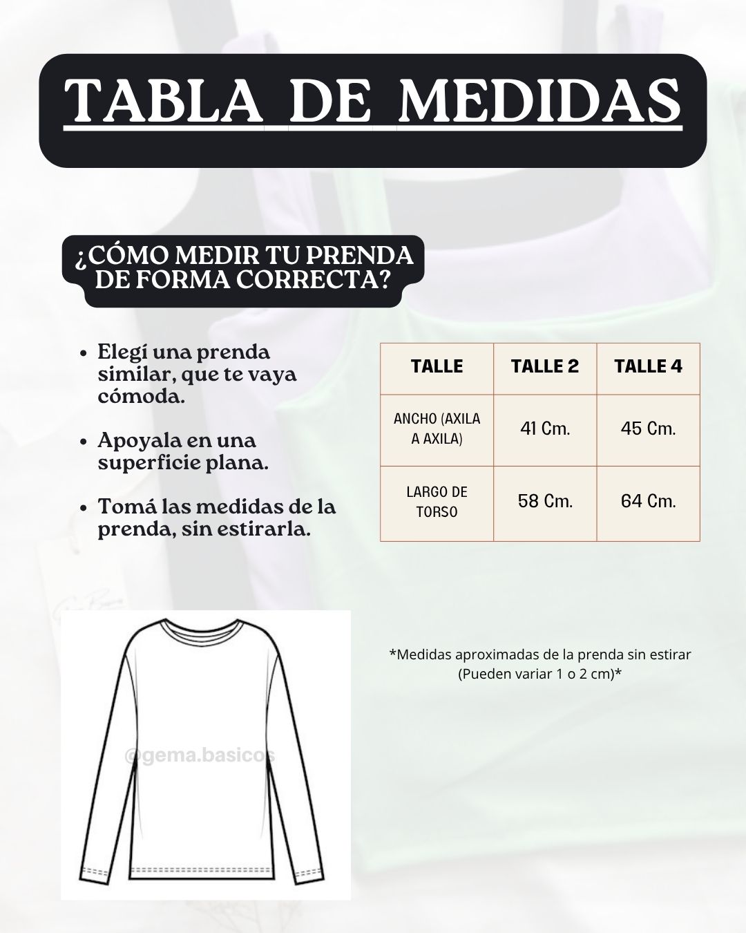 💟 Este modelo está disponible en Talle 2 (Abarca Talle S/M) y Talle 4 (Abarca Talle L/XL) - Este detalle es sólo orientativo, SIEMPRE compará una prenda tuya con las medidas de la tabla para asegurarte que es la prenda que estás buscando-